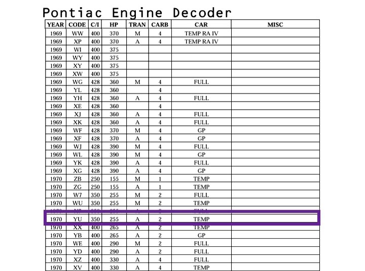 The “YU” suffix after the engine number can indicate if this is indeed a Pontiac V8 engine or not and if it’s period-correct, just in case it’s a replacement engine.