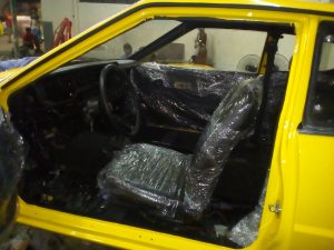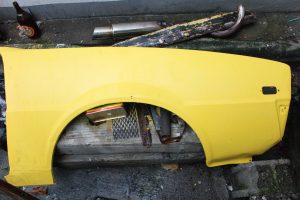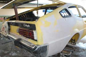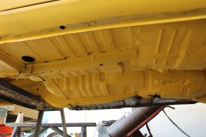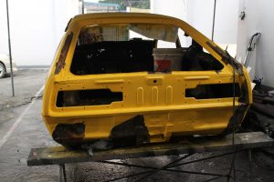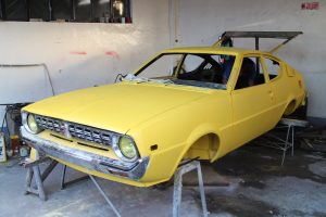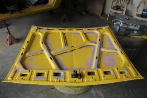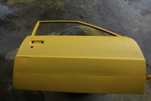 The body of our Celeste was ready for paint by April 2017. We, however, weren’t ready yet. We haven’t really decided on what color to use. Initially, we thought it would be great to keep it in its factory-applied BB-code medium dark blue instead of the light metallic blue it had when we bought it. We also thought of finishing it in Aqua Marine Blue, which was a popular color for American muscle cars but not appropriate for an Old Schooler. While our Celeste was coated in yellow etching primer, we had an epiphany: Let’s color it Ferrari Fly Yellow! It would be perfect for displays in car shows!