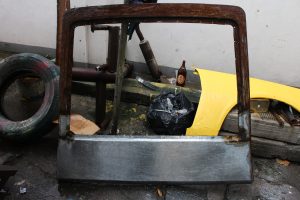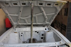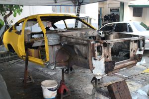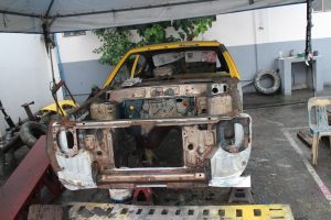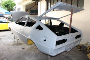 The technicians at JSK Custom did not waste time deconstructing and disassembling our rusty Celeste. By the second week of July 2016, the body has been reduced to its bare shell, and the fenders, doors, front hood, rear hatch, interior, engine, transmission, driveshaft, rear differential, gas tank, suspension, and wiring harness were all removed. All the rusted portions were either cut away, are being repaired, or are being fabricated. Various parts of the car were either being stored or cleaned by the JSK technicians.