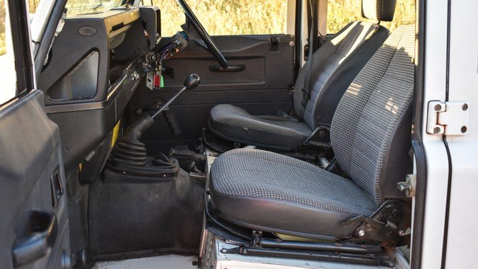 There are no carpets or mats inside the Land Rover, so it’s likely to be pretty noisy but it will also be pretty easy to clean when there’s mud and muck after an off-road expedition. The seats are covered with cloth instead of vinyl, the driver’s seat is a bit worn, the interior is quite dirty, and the seat padding needs to be replaced but overall, the interior just looks like it could use a little cleaning, especially if you’re going to take this Double Cab into the ruts. This Defender seats five people so there’s more muddy shoes, pants, and gloves to soil the upholstery.