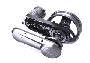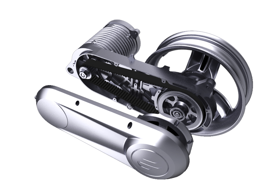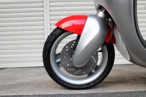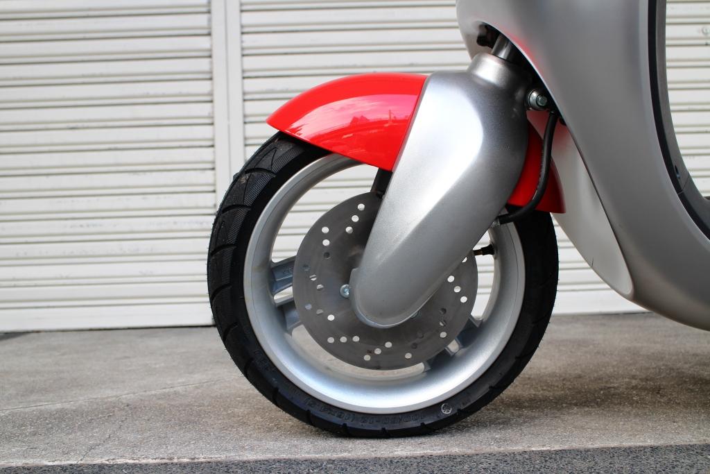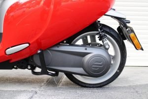 The Ecooter E1+ is propelled by a 2.5 kilowatt aluminum magnet electric motor that is mounted in an enclosed swing arm assembly. A strong and durable Gates carbon drive belt connects the motor to the drive hub that mounts the 12-inch three split-spoke aluminum alloy wheel shod in a 100/60-12 Kenda tubeless tire. Unlike hub-mounted electric motors, the sealed drivetrain of the E1+ allows it to be ridden in flood waters as high as 260 mm, thus dispelling the notion that electric scooters cannot be ridden in the wet.