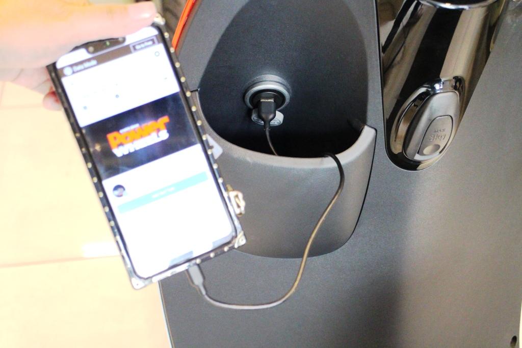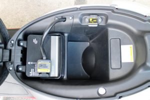 Our test E1+ electric scooter is finished in eye-catching two-tone Ducati red (that’s what they really call it) and silver. The comfortable and thickly cushioned black saddle is mounted low, measuring only 730 mm from the ground, while the handlebar is 10 mm higher and all controls fall easily to hand. A storage bin in the front leg shield includes a USB socket to charge mobile phones. Night time riding visibility is enhanced with front LED headlights with a wide light swath area and integrated tail light with enhanced illumination.