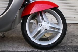 The drivetrain / rear swing arm assembly and single rear aluminum coil-over shock absorber are attached to an alloy steel frame that is covered by stylishly designed plastic body panels. At the front, a single arm inverted front fork supports the aluminum single-sided steering stem that mounts front wheel and tire. A combination brake system (CBS) connects the front and rear hydraulic disc brakes.