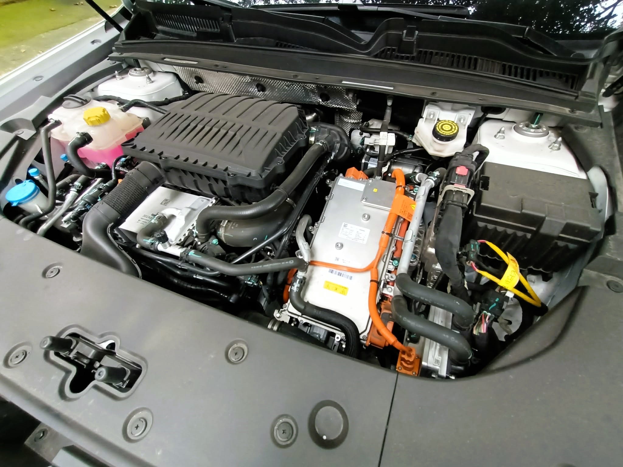 Under the hood sits the 1.5-liter turbo GDI engine, the DHT, the electric motor and controller system in a compact package. From this angle, we couldn’t tell if the hybrid system is a PHEV or REEV.
