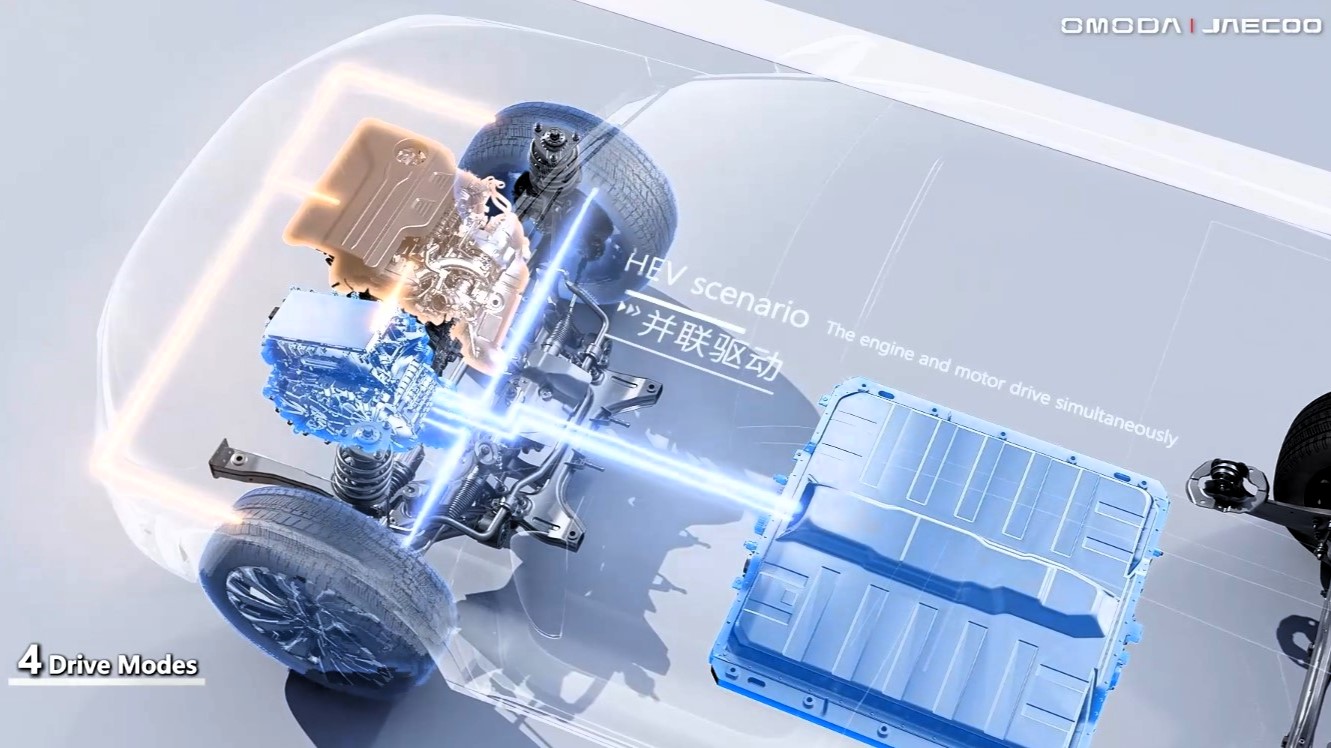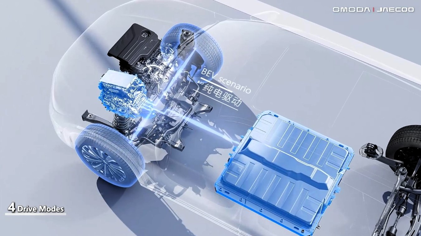 Under the BEV scenario of the J7 SHS Premium’s “4 Drive Modes”, the battery pack powers the electric motor, which in turn drives the front wheels to propel the vehicle.