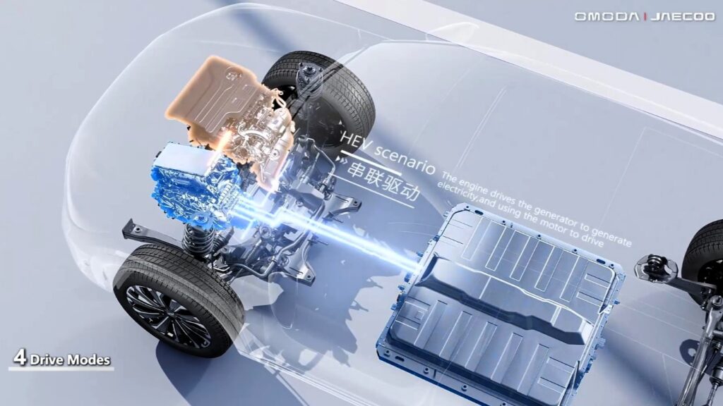 We then wondered why the quoted combined power and torque output of 275 hp and 365 Nm didn’t add up as a hybrid system. When we took a closer look at the specs sheet, we saw that Jaecoo labeled the gasoline engine outputs as “Ranger Extender Power (hp)” and “Ranger Extender Torque (nm)”, which led us to believe that the J7 SHS Premium is an REEV. But then, the website’s SHS video provided us with a more definitive explanation: Jaecoo’s unique “4 Drive Modes” seemingly makes it an all-in-one BEV, REEV, PHEV and Energy Recovery system. It works like this: