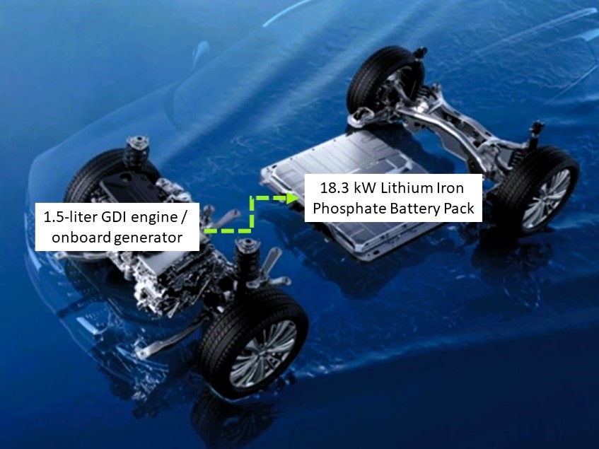 Under the HEV scenario, the 1.5T GDI engine and the electric motor work “simultaneously” to drive the front wheels and charge the battery at the same time, which implies that the engine also provides some drive to the wheels.