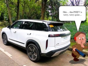 The first impression we had of the J7 SHS Premium once we got to drive it is that it’s very quiet. (Is it like what Elmer Fudd said, “Shh… Be vewy, vewy quiet…”? Heh-heh-heh – Ed.) In pure electric or BEV mode, the vehicle crawls silently from rest while its NVH (noise, vibration and harshness) insulation system minimizes road noise and tire hum while driving at speed. We can only hear the engine when it functions like an REEV to recharge the battery when the charge falls below 25%. And since we drove this Jaecoo mostly around the metropolis in heavy, slow-moving traffic during the Christmas rush, it ran mostly on electric power.