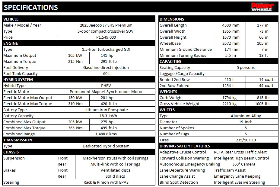 This question came into mind when we test drove the 2025 Jaecoo J7 SHS Premium a week before the holidays. Initially, we thought that it was a PHEV because SHS stands for Super Hybrid System, which was further supported by the J7 SHS Premium’s specs that are listed in the Omoda Jaecoo Philippines website, quoting the horsepower and torque output of the 1.5-liter turbocharged gasoline direct injection (GDI) engine at 141 hp and 215 Nm, and the output of the 150kW permanent magnet synchronous electric motor at 201 hp and 310 Nm. (Don’t forget, there’s also a “PHEV” emblem at the tailgate, which officially makes it a PHEV. – Ed.)