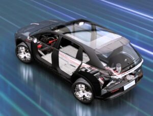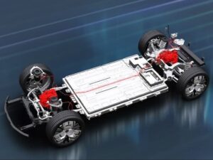 Front 202-kW and rear 253-kW electric motors (in red) combine to produce 455 kW (610 hp) and 756 Nm of torque delivered through an AWD system.