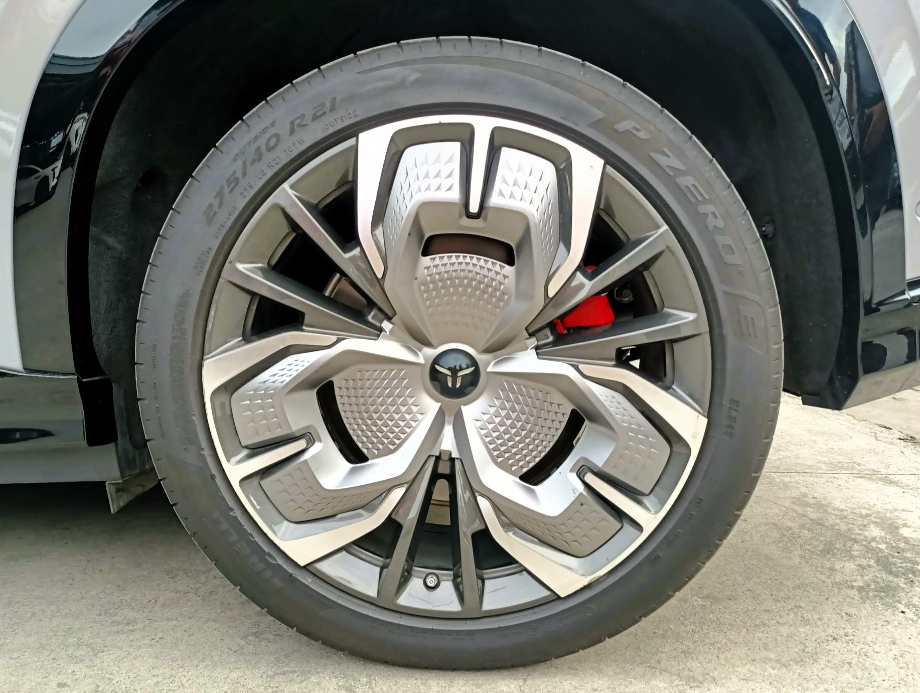 Unique 21-inch alloy wheels looks like it has 3 fat spokes instead of the actual 12 spokes. Tires are Pirelli PZero 255/45R21 in front and 275/45R21 at the back.
