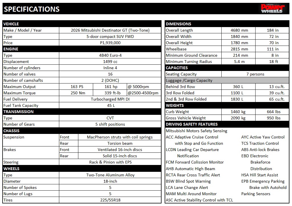 All these safety features plus the upgraded 8-speaker Dynamic Sound Yamaha audio system, smart rear view mirror, hands-free power tailgate and two-tone paint finish adds P340,000 over the GLS’ SRP, which prices our 2026 Mitsubishi Destinator GT at P1,939,000. The price tag might sound a bit hefty but like the GLS, the GT is attractive, fun to drive, nimble around the city, and surprisingly fuel-efficient. The GT’s additional features, such as the panoramic sunroof, hands-free power tailgate and 64-color ambient lighting takes it upmarket a couple of notches more, while the tried-and-tested Mitsubishi aftersales and service support makes it worth considering.