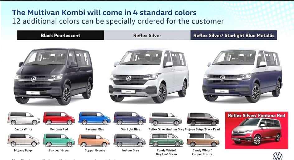 The Multivan Kombi Highline comes in four standard colors: Black Pearlescent, Reflex Silver, and the Bi-Colors Reflex Silver/Starlight Blue Metallic and Reflex Silver/Fontana Red. An additional 12 colors are available for special orders: Fontana Red, Ravenna Blue, Starlight Blue, Mojave Beige, Bay Leaf Green, Copper Bronze, Indium Grey, Candy White, and the Bi-Colors Reflex Silver/Indium Grey, Mojave Beige/Black Pearl, Candy White/Bay Leaf Green, and Candy White/Copper Bronze.