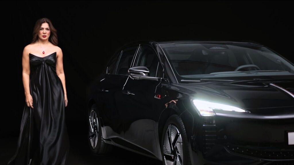 Alice Dixson in an elegant attire next to an equally elegant Hongqi E-H7 4-door premium electric sedan.