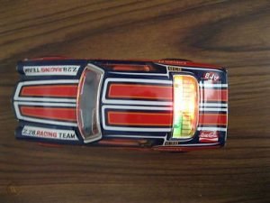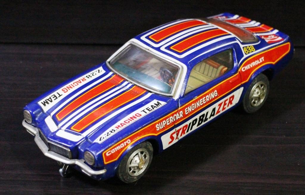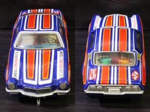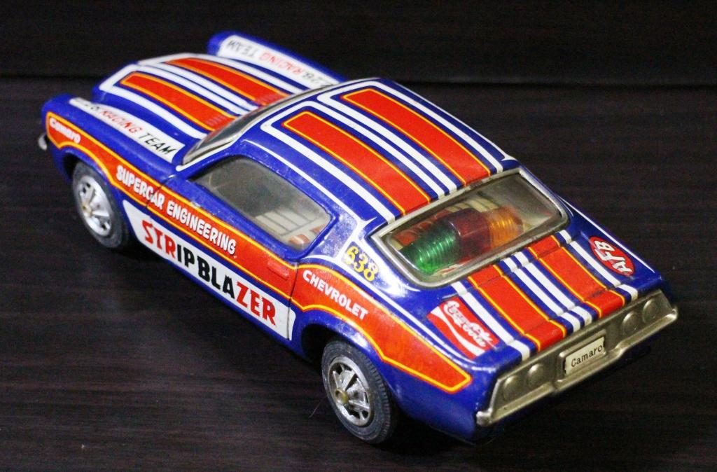 Our fully-operational battery-operated Strip Blazer tin toy was made by Taiyo in 1970. We can only guess that Taiyo just added the racing livery to their battery-operated 1970 Camaro Bump ‘N Go tin toy to imitate the colors of Malcolm Durham’s Strip Blazer Funny Car without adding wider wheels and drag slicks at the back and jacking up the rear to imitate the original car’s drag racing stance.