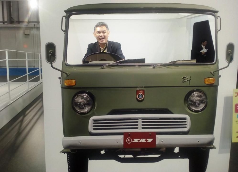 A photo booth standee of the first Isuzu Elf gave the author a rare opportunity to drive a vintage truck.