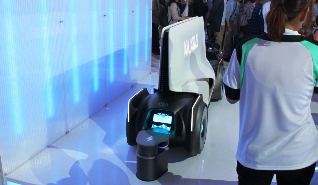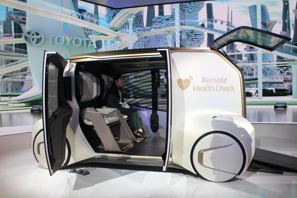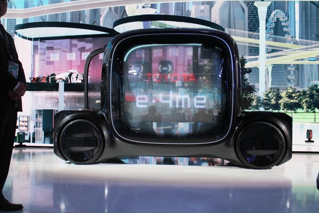 The Toyota e-4me autonomous single-seat mobility platform allows the passenger to use the time while en route to do what he/she wants and enjoy various services without worrying about other people.
