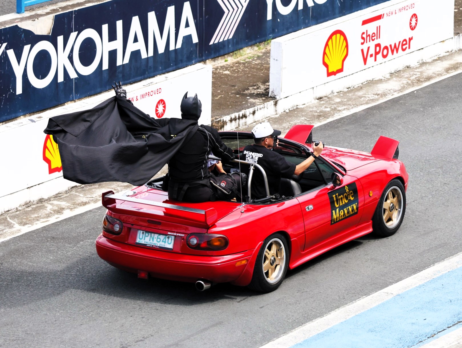… led by the Batman on board the Uncle Maxxx Mazdaspeed Miata NA. (Uh, what happened to the Batmobile?)