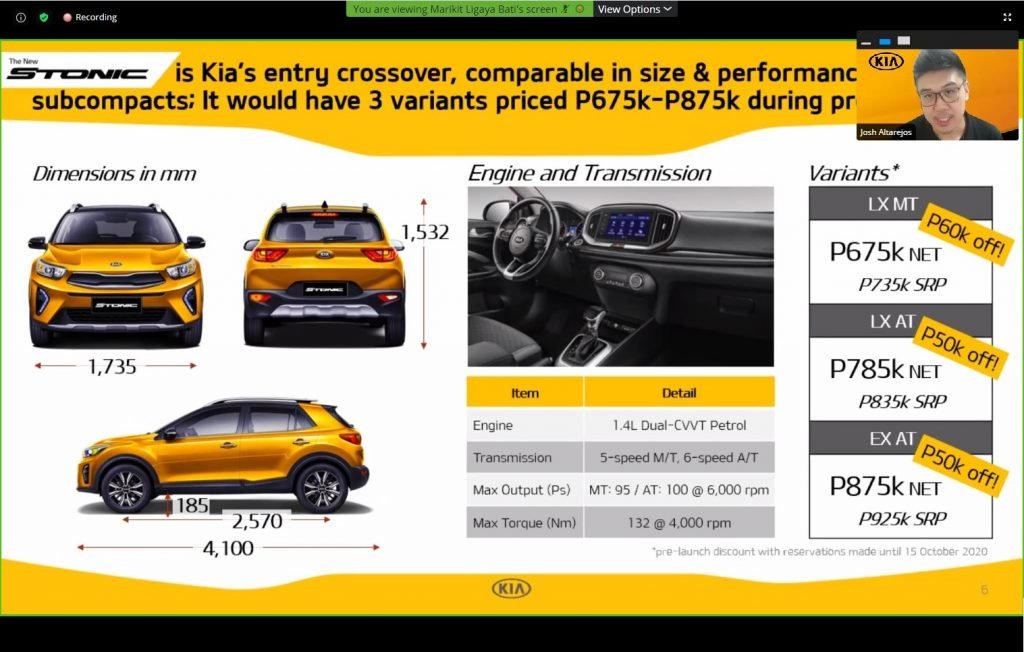 Kia Philippines saw the market shift towards subcompact SUVs with a median price in the P1,000,000 level. The 2021 Kia Stonic is being offered at an introductory price of P675,000 for the entry-level variant with 5-speed manual transmission (LX MT), P785,000 for the middle-range variant with 6-speed automatic transmission (LX AT) and P875,000 for the top-of-the-line variant with 6-speed automatic transmission (EX AT).