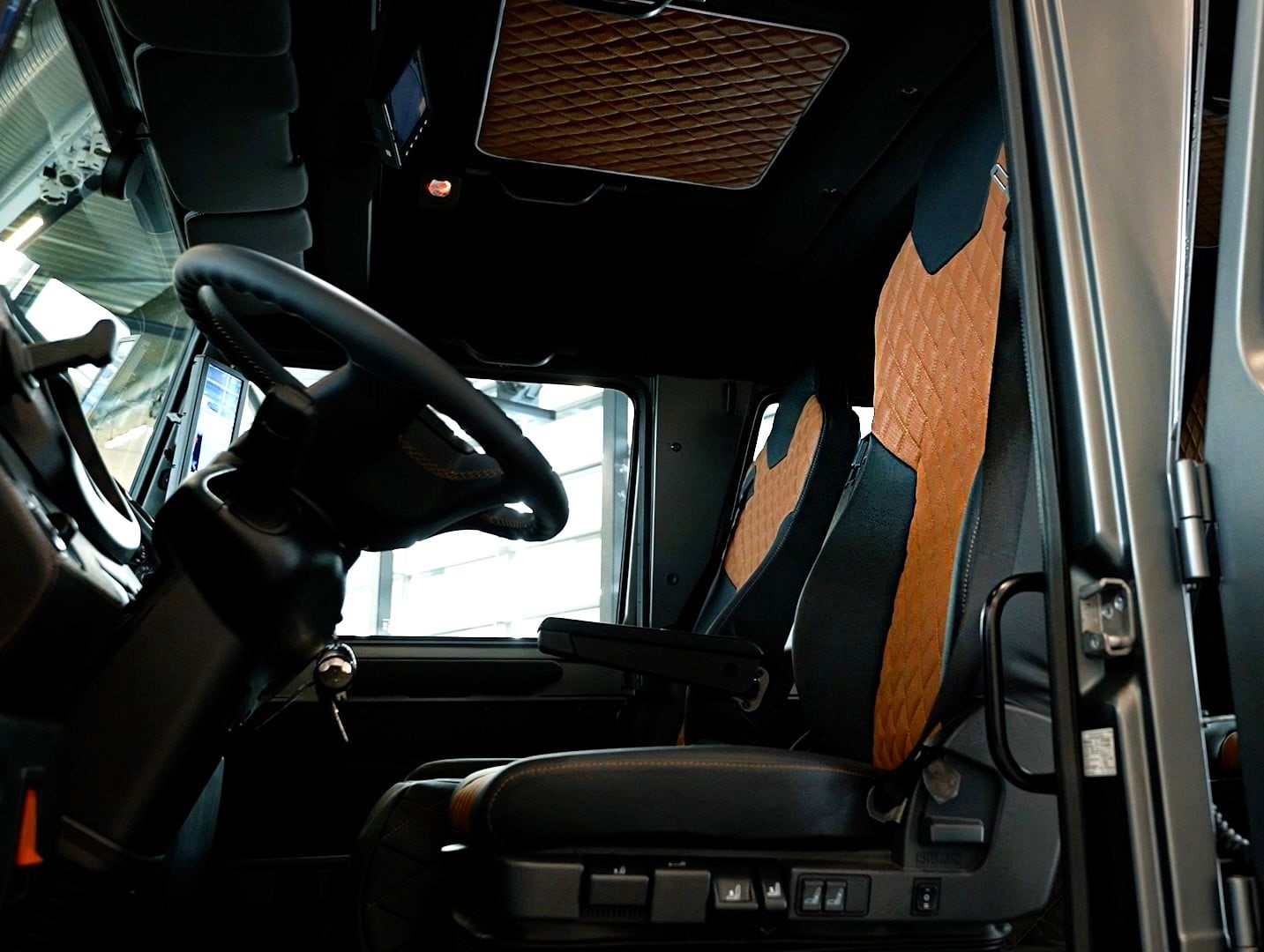 The standard four-cylinder engine has been replaced by a Mercedes-Benz six-cylinder OM 936 delivering 300 hp (220 kW). This modification provides higher performance, optimized transmission tuning, and increased driving comfort. The double cab offers space for up to four people. A MirrorCam system has also been installed: digital cameras and monitors replace traditional exterior mirrors, providing improved all-round visibility and enhanced safety.