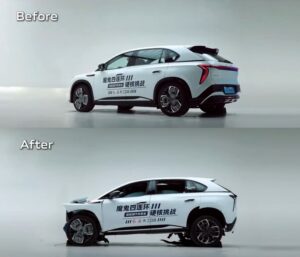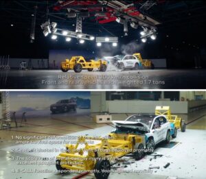 The Dedicated Side Impact Assessments hurled the Hongqi EVs against a strong, stationary barrier at speed to simulate skidding sideways into a fixed heavy object, such as a utlity pole or a sturdy tree. The E-H7 and E-HS7 body deformed within a reasonable range, showed no significant deformation of the pillars so the doors can be opened normally, and with side airbags and air curtains deploying as designed. It achieved a 100% score rate resulting in excellent occupant protection.