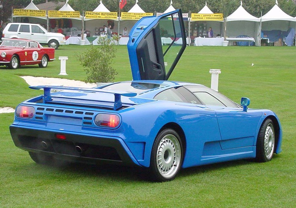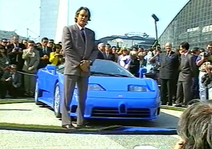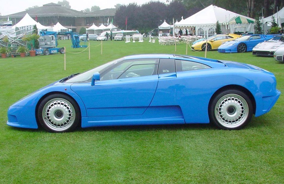 On September 15, 1991, the Bugatti EB 110 GT was unveiled at both Versailles and in front of the Grande Arche de la Défense, near Paris, exactly 110 years after Ettore Bugatti‘s birth. The mid-engine sports car’s design elements paid homage to the classic Bugatti automobiles. The factory, Bugatti Automobili S.p.A., was owned by Italian businessman Romano Artioli, and the name EB 110 was an abbreviation for Bugatti and his 110th birthday.