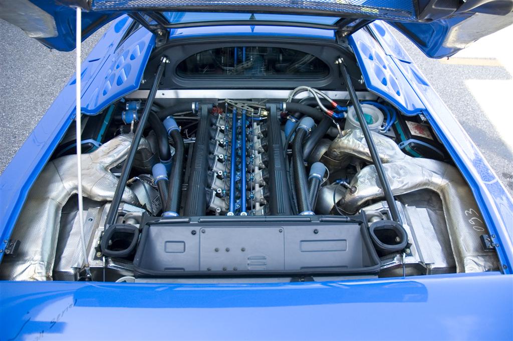 A glass engine cover provides a view of the 553-horsepower 3.5-liter 60-valve, quad-turbocharged V12 engine with 12 individual throttle bodies. Power is routed through a 6-speed manual transmission and sent to all four wheels. The carbon fiber chassis was built by Aérospatiale, an aircraft company, and uses a double wishbone suspension. A speed-sensitive electronic rear wing and active air flaps near the rear window that can be electrically actuated assist the car’s aerodynamics.