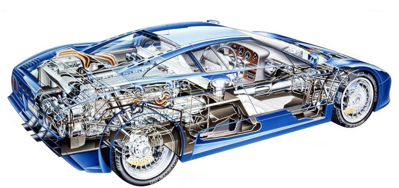 Technical director Paolo Stanzani, formerly of Lamborghini, designed most of the EB 110’s engineering. After Stanzani’s sudden departure from Bugatti, Nicola Materazzi, formerly of Lancia and Ferrari, was assigned to complete the development. Innovative technologies such as the carbon fiber monocoque chassis, active aerodynamics, and an all-wheel-drive (AWD) were installed in the Bugatti.