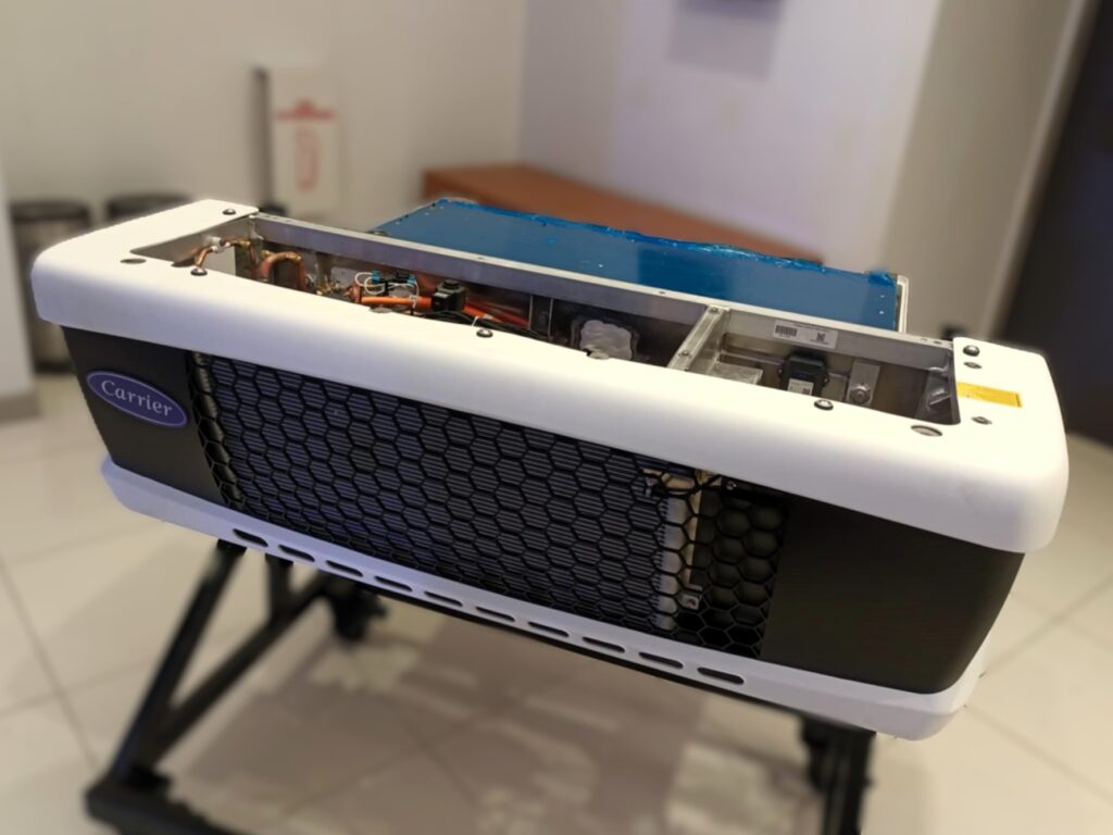 Carrier Pulsor 6 eCool mounted on a demo stand on display at the Park Inn lobby.