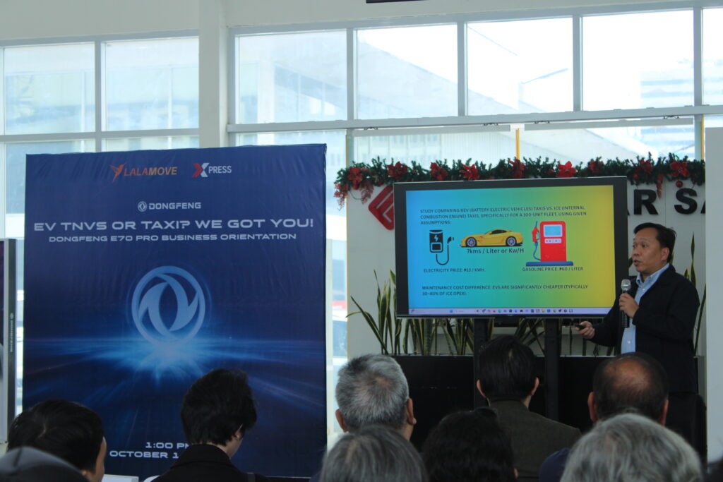 Mr. Giovanni Frias, Vice President for Operations at Dongfeng Motors Philippines, took center stage with a compelling presentation comparing EVs to traditional internal combustion engine (ICE) vehicles. He highlighted that an EV taxi can save up to PHP 612,470 annually on fuel costs alone — a game-changing figure for fleet operators seeking to maximize profits.