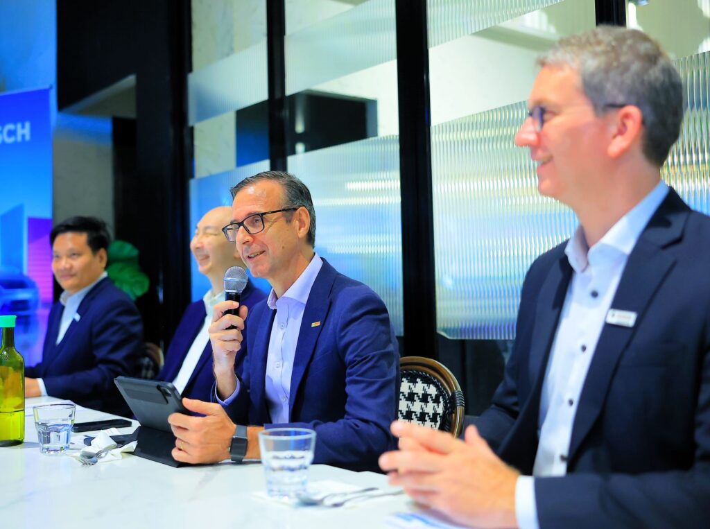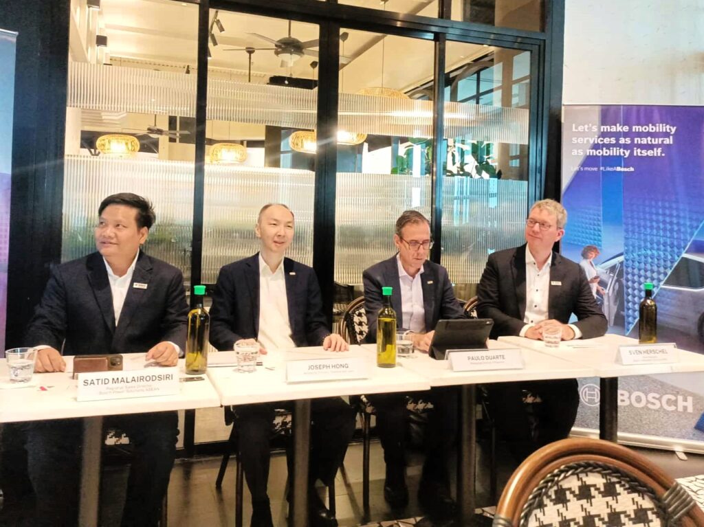 Bosch executives share how the company can help drive smart and sustainable mobility in the country. From left: Satid Malairodsiri, Regional Sales Director, Bosch Power Solutions ASEAN; Joseph Hong, Managing Director, Bosch Thailand and Laos; Paulo Duarte, Managing Director, Bosch Philippines; and Sven Herschel, Vice President, Bosch Connected Services APAC.