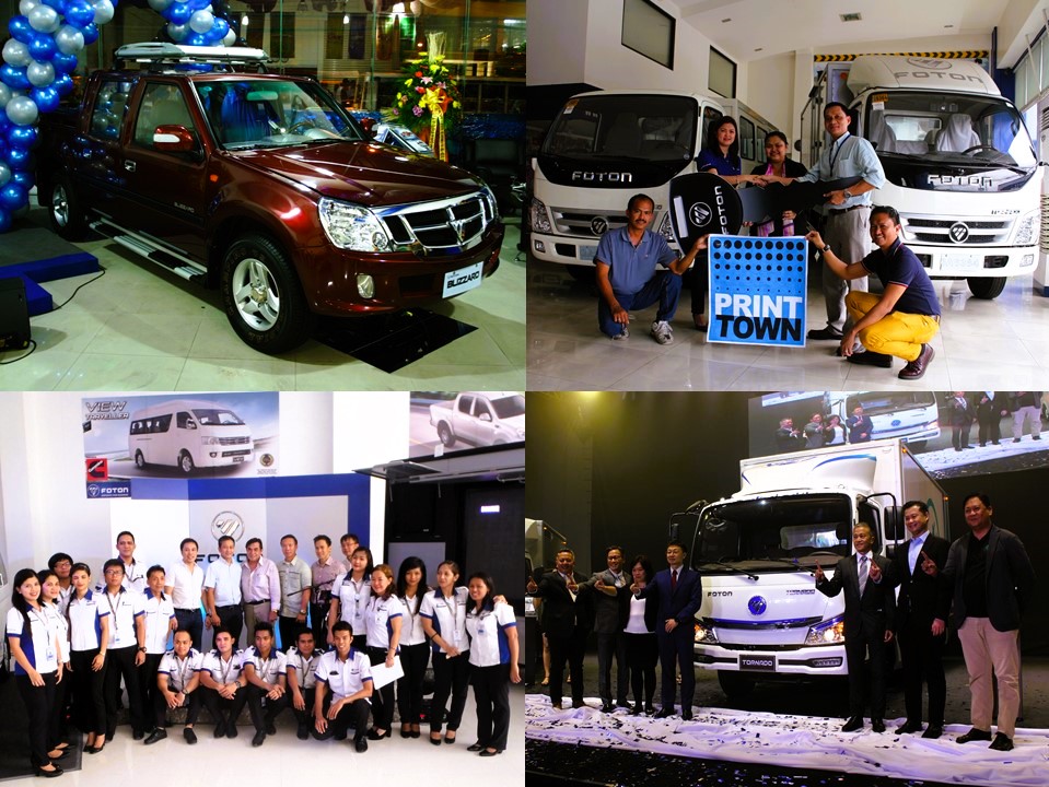 Top: The Foton Blizzard during its launch in 2008. Turnover of Foton Tornado trucks to a corporate customer. Bottom: Dominic and Rommel Sytin (8th and 9th from left, in white) during the opening of Foton GMA Cavite in 2014. UAAGI and Foton executives and VIP guests at the Foton Big Show in 2023.