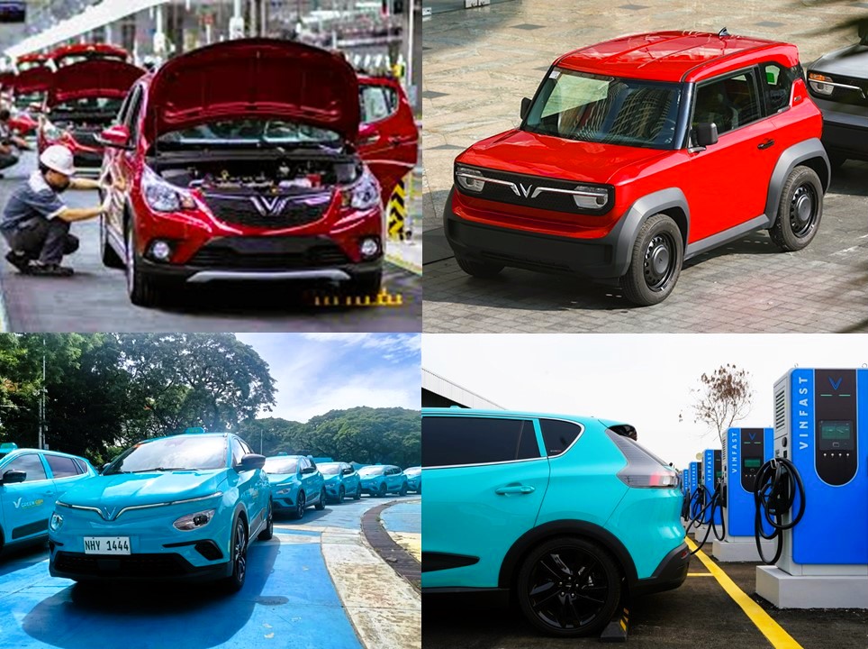 Top: The VinFast assembly line in Vietnam in 2017. At P590,000 he VinFast VF3 is the most affordable EV model under the Battery Subscription program. Bottom: VinFast Herio Green VF5 Green GSM electric taxi fleets. VinFast charging stations offere free charging until 2029.
