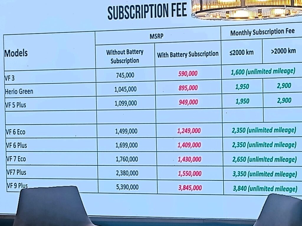 The VinFast pricing table that was presented during the January 2026 MRTD showed the financial savings that can be achieved with the Battery Subscription Program.