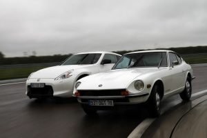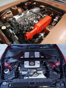 The Datsun 240Z relied on a twin-carburetor, overhead camshaft (OHC) 12-valve 2.4-liter inline 6-cylinder engine that churns out 151 horsepower and 198 Newton-meters of torque. The classic L24 inline-6 is mated to a 4- or 5-speed manual transmission or an optional 3-speed automatic transmission. In comparison, the Nissan 370Z is powered by a fuel-injected, double overhead camshaft (DOHC) 24-valve 3.7-liter V6 engine that makes 328 hp and 363 Nm of torque. The award-winning VQ37 V6 is mated to either a 6-speed stick shift with the world’s first SynchroRev matching system or a 7-Speed automatic with Downshift Rev Matching feature and controlled by magnesium paddle shifters. Power is delivered to the Limited Slip Differential though a strong and lightweight carbon fiber composite driveshaft.