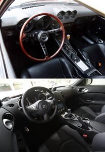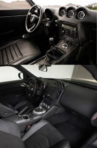 The interior of the 240Z provided the occupants with ample room and comfort as well as some lateral support during cornering maneuvers. The driver grips a wood-rimmed 3-spoke steering wheel and shifts gears using a shift lever with a wooden knob. The driver-oriented cockpit of the new 370Z Premium mimics the dashboard design of the original 240Z, with its two large round binnacles housing the speedometer and tachometer and three smaller round binnacles housing other gauges.